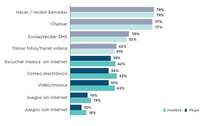 Esta brecha se refiere a las distintas formas en que se utilizan las TIC, así como al nivel de conocimiento o capacitación que poseen las personas para aprovecharlas en la resolución de diversas situaciones. De acuerdo con Agüero et al. (2020), la función principal de las TIC es la comunicación, lo que incluye realizar llamadas, chatear y enviar o recibir mensajes. Sin embargo, existen diferencias entre hombres y mujeres; los hombres tienden a utilizar el teléfono móvil con mayor frecuencia para actividades como jugar, ver videos, escuchar música y revisar el correo electrónico (véase Gráfico N°1).